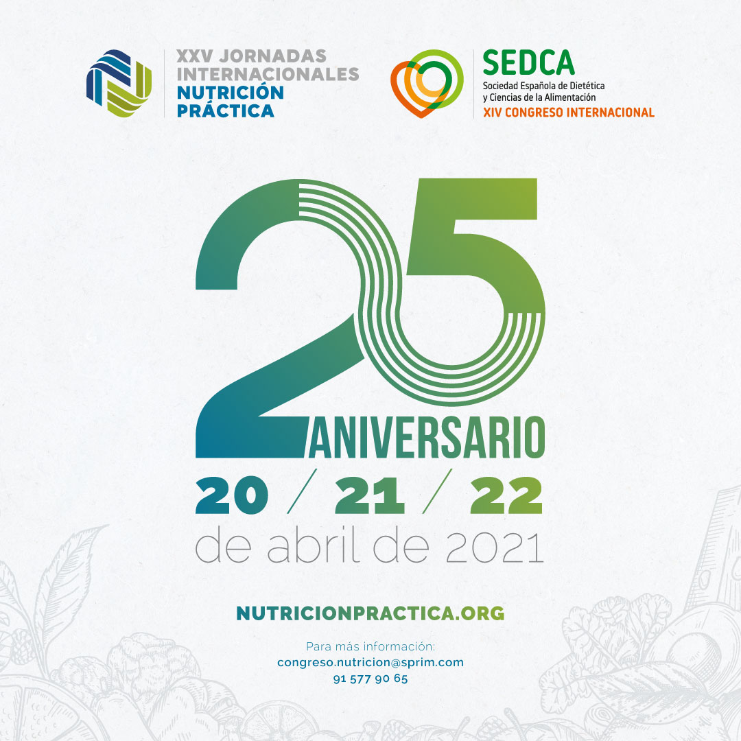 Del 20 al 22 de abril se celebran, de manera virtual, el 25 aniversario de las Jornadas Internacionales de Nutrición Práctica y el XIV Congreso Internacional de Nutrición, Alimentación y Dietética. Un congreso organizado por la Sociedad Española de Dietética y Ciencias de la Alimentación (SEDCA) y SPRIM, que estará dirigido a profesionales de la salud de distintas áreas.
